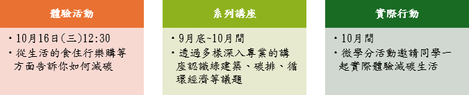 本校於申請AI+SDGs=∞、ESG+AI=∞商標專利後,宣告以AI及永續為發展目標,我們也在思考「學生端的永續應該是什麼?」,在以服務學生為先、成就學生為要的學務處,責無旁貸的挑起學生永續的宣導、教育與實踐。2024年榮獲環境部大專校院淨零綠生活教育方案補助,透過辦理體驗活動及系列講座的方式,將淨零綠生活推廣至大學生活與周遭社區,並邀請社區一同參與活動,一起認識並實踐淨零綠生活!