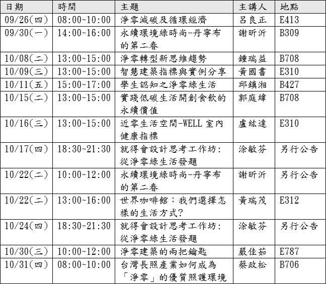 依環境部「淨零綠生活指引」、「環境部淨零綠生活關鍵戰略行動計畫」內容,邀請業界專家至校內進行演講及工作坊,讓大家瞭解淨零綠生活其實可以很專業。